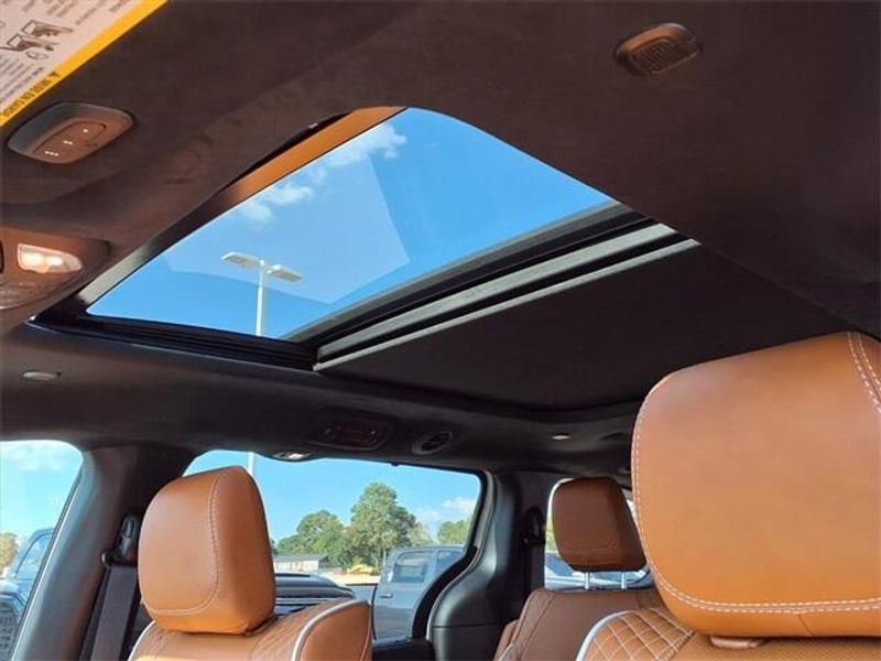 THIS VEHICLE COMES WITH THE FOLLOWING FEATURES AND OPTIONS : Quick Order Package 27S, 19 Speakers, 3.25 Axle Ratio, 3rd row seats: split-bench, 4-Wheel Disc Brakes, A/V remote, ABS brakes, Air Conditioning, Alloy wheels, AM/FM radio: SiriusXM 360L, Apple CarPlay/Android Auto, Audio memory, Auto-dimming door mirrors, Auto-dimming Rear-View mirror, Automatic temperature control, Bodyside moldings, Brake assist, Bumpers: body-color, Compass, Delay-off headlights, Driver door bin, Driver vanity mirror, Dual front impact airbags, Dual front side impact airbags, Electronic Stability Control, Emergency communication system: Chrysler Connect, Four wheel independent suspension, Front anti-roll bar, Front Bucket Seats, Front Center Armrest, Front dual zone A/C, Front fog lights, Front reading lights, Fully automatic headlights, Garage door transmitter, harman/kardon Speakers, Headphones, Heated door mirrors, Heated front seats, Heated rear seats, Heated steering wheel, Illuminated entry, Knee airbag, Low tire pressure warning, Lumbar Pillow, Memory seat, MyFlexCare Service Plan, Navigation System, Occupant sensing airbag, Outside temperature display, Overhead airbag, Overhead console, Panic alarm, ParkView Rear Back-Up Camera, Passenger door bin, Passenger vanity mirror, Power door mirrors, Power driver seat, Power Liftgate, Power moonroof, Power passenger seat, Power steering, Power windows, Premium Leather Trimmed Bucket Seats, Radio data system, Radio: Uconnect 5 Nav w/10.1'' Display, Rain sensing wipers, Rear air conditioning, Rear reading lights, Rear window defroster, Rear window wiper, Reclining 3rd row seat, Remote keyless entry, Roof rack, Security system, Sepia Seat Color, Speed control, Split folding rear seat, Spoiler, Steering wheel mounted audio controls, Tachometer, Telescoping steering wheel, Tilt steering wheel, Touring Suspension, Traction control, Trip computer, Turn signal indicator mirrors, Variably intermittent wipers, Ventilated front seats, Voltmeter, and Wheels: 20'' x 7.5'' Paint/Polish Aluminum Design 2.