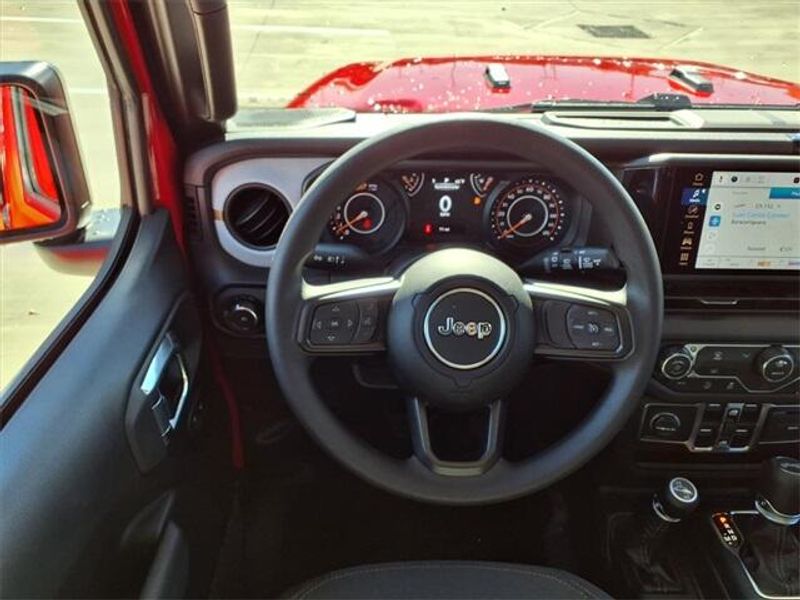 THIS VEHICLE COMES WITH THE FOLLOWING FEATURES AND OPTIONS : Quick Order Package 24B Sport, 12.3'' Touchscreen Display, 3.45 Overall Top Gear Ratio, 4-Wheel Disc Brakes, 4G LTE Wi-Fi Hot Spot, 8 Speakers, ABS brakes, Air Conditioning, AM/FM radio: SiriusXM with 360L, Apple CarPlay, Apple CarPlay/Android Auto, Aux Battery, Black 3-Piece Hard Top, Black Vinyl Floor Covering, Brake assist, Cargo Compartment Dress-Up, Cloth Low-Back Bucket Seats, Compass, Connectivity - US/Canada, Deep Tint Sunscreen Windows, Delay-off headlights, Driver door bin, Driver vanity mirror, Dual front impact airbags, Dual front side impact airbags, Electronic Stability Control, For More Info, Call 800-643-2112, Freedom Panel Storage Bag, Front anti-roll bar, Front Bucket Seats, Front Center Armrest w/Storage, Front fog lights, Front reading lights, Google Android Auto, Illuminated entry, Integrated Center Stack Radio, Integrated roll-over protection, Low tire pressure warning, Myflexcare Service Plan, Non-Lock Fuel Cap Without Discriminator, Normal Duty Suspension, Occupant sensing airbag, Outside temperature display, Overhead airbag, Panic alarm, ParkView Rear Back-Up Camera, Passenger door bin, Passenger vanity mirror, Power steering, Power windows, Radio data system, Radio: Uconnect 5 with 12.3'' Display, Rear anti-roll bar, Rear reading lights, Rear Window Defroster, Rear Window Wiper/Washer, Remote keyless entry, SiriusXM Radio Service, SiriusXM with 360L, Speed control, Split folding rear seat, Steering wheel mounted audio controls, Stop-Start Dual Battery System, Tachometer, Telescoping steering wheel, Tilt steering wheel, Traction control, Trip computer, Variably intermittent wipers, and Wheels: 17'' x 7.5'' Black Steel Styled.