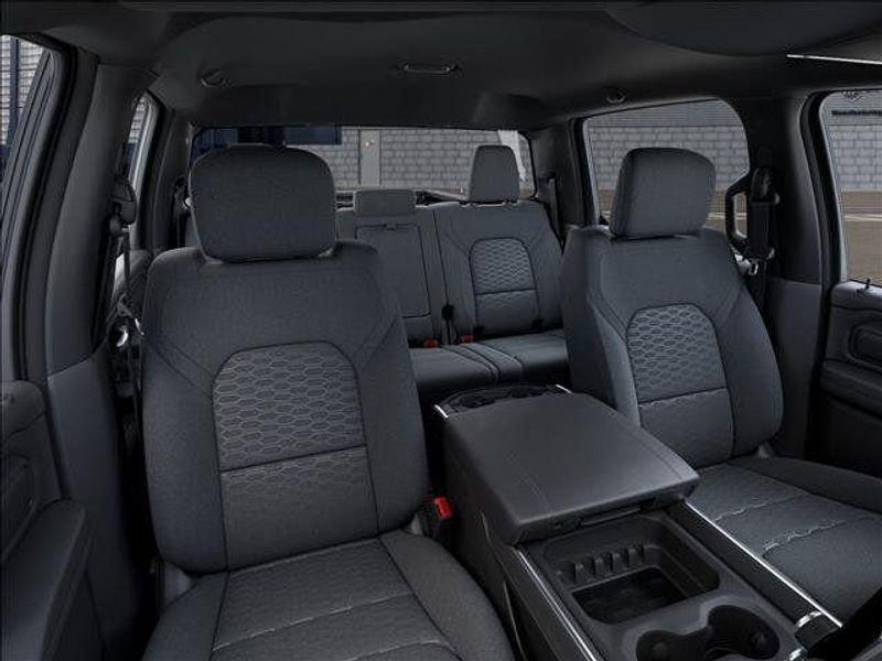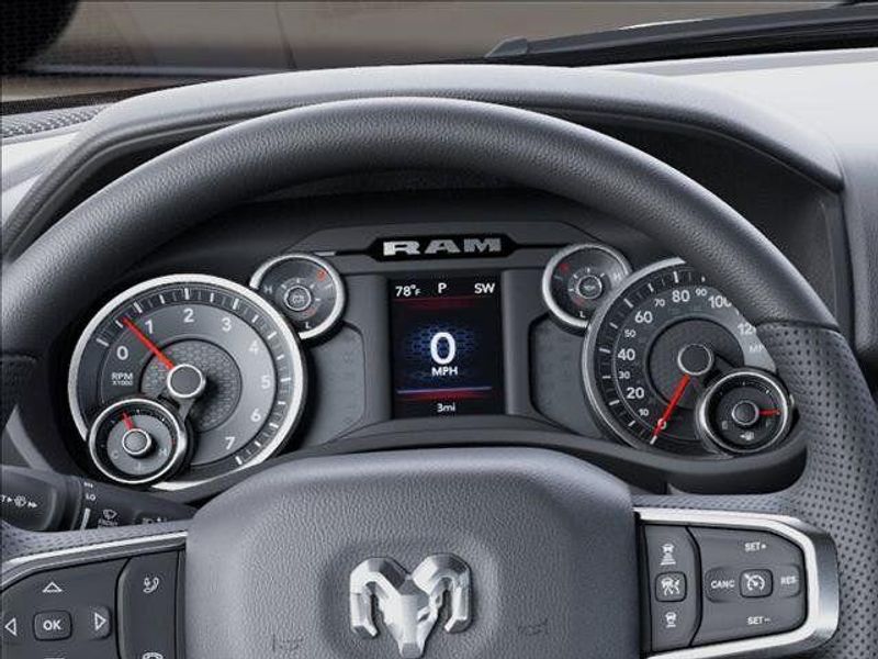 THIS VEHICLE COMES WITH THE FOLLOWING FEATURES AND OPTIONS : Quick Order Package 23R Lone Star (Lone Star Badge), 3 Rear Seat Head Restraints, 3.21 Rear Axle Ratio, 4 Way Front Headrests, 4-Wheel Disc Brakes, 48V Belt Starter Generator, 4G LTE Wi-Fi Hot Spot, 6 Speakers, ABS brakes, Air Conditioning, Alloy wheels, AM/FM radio, Anti-Spin Differential Rear Axle, Apple CarPlay, Apple CarPlay/Android Auto, Auto High-beam Headlights, Black Exterior Mirrors, Brake assist, Bucket Seats, Bumpers: chrome, Center Console Parts Module, Cloth Bucket Seats, Compass, Connectivity - US/Canada, Convex Wide-Angle Exterior Mirror Insert, Delay-off headlights, Driver door bin, Dual front impact airbags, Dual front side impact airbags, Electronic Stability Control, Exterior Mirrors with Heating Element, Exterior Parking Camera Rear, Front anti-roll bar, Front Bucket Seats, Front Center Armrest w/Storage, Front fog lights, Front License Plate Bracket, Front reading lights, Front wheel independent suspension, Full Length Floor Console, Fully automatic headlights, Global Telematics Box Module, Google Android Auto, GPS Antenna Input, Heated door mirrors, Illuminated entry, Integrated Center Stack Radio, Integrated Voice Command with Bluetooth, Low tire pressure warning, Manual Adjust 4-Way Driver Seat, Manual Adjust 4-Way Front Passenger Seat, Manual Folding Exterior Mirrors, Manufacturer's Statement of Origin, MOPAR Front and Rear Rubber Floor Mats, MyFlexCare Service Plan, Occupant sensing airbag, Outside temperature display, Overhead airbag, Overhead console, Panic alarm, Passenger door bin, Passenger vanity mirror, Power door mirrors, Power steering, Power windows, Radio data system, Radio: Uconnect 5 W with 8.4'' Display, RAM Grille Badge - Chrome, Rear anti-roll bar, Rear step bumper, Remote keyless entry, Speed control, Supplier Part Tracking (J-1), Tachometer, Telescoping steering wheel, Tilt steering wheel, Traction control, Trip computer, USB Host Flip, Variably intermittent wipers, Voltmeter, and Wheels: 18'' x 8'' Cast-Aluminum Painted.