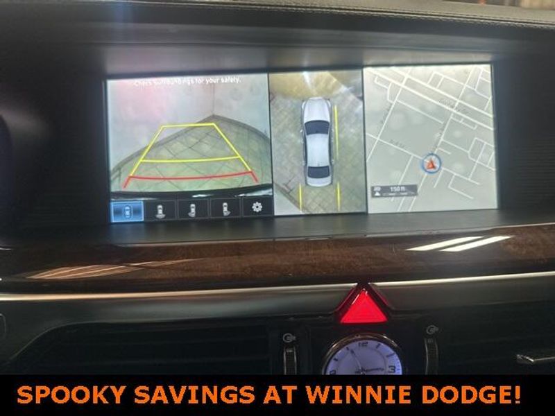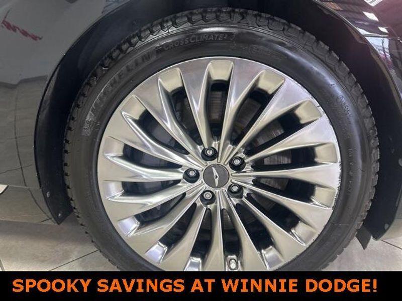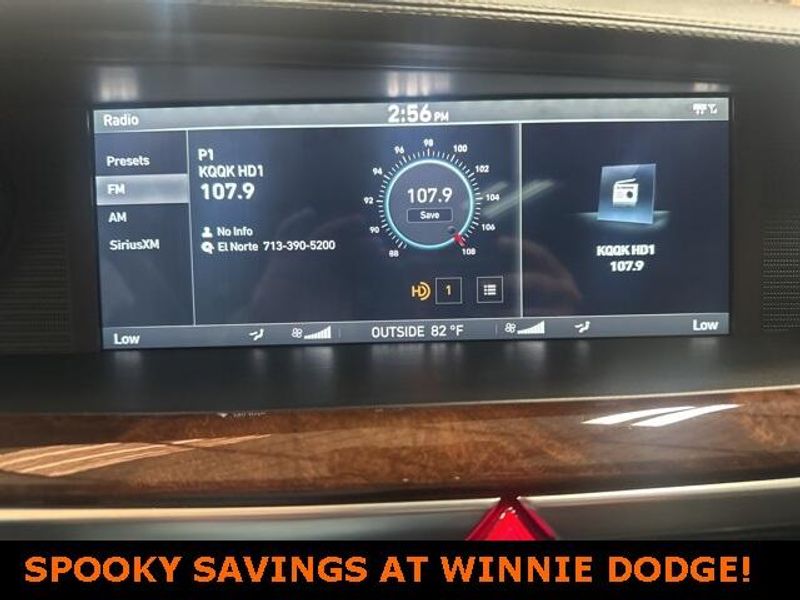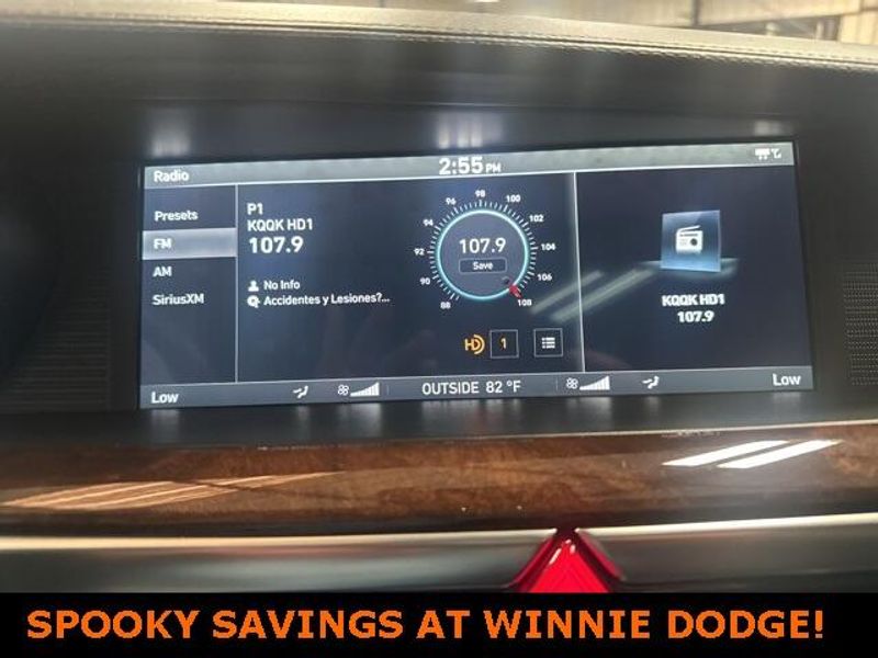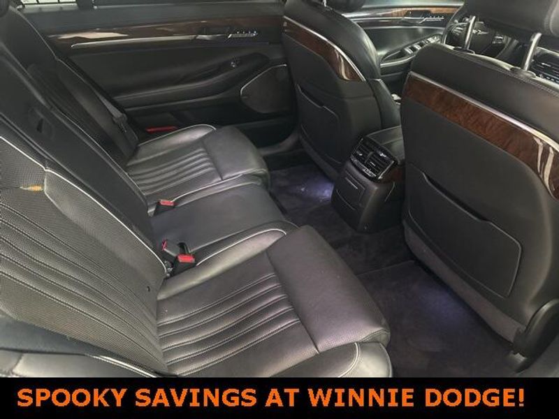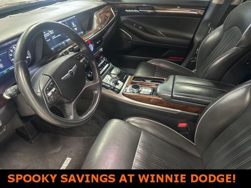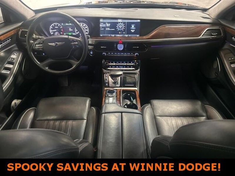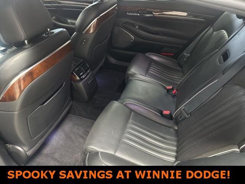 THIS VEHICLE IS EQUIPPED THE FOLLOWING FEATURES AND OPTIONS: Option Group 01, 17 Speakers, 4-Wheel Disc Brakes, ABS brakes, Adaptive suspension, Air Conditioning, Alloy wheels, AM/FM radio: SiriusXM, Auto High-beam Headlights, Auto tilt-away steering wheel, Auto-dimming door mirrors, Auto-dimming Rear-View mirror, Auto-leveling suspension, Automatic temperature control, Bodyside moldings, Brake assist, Bumpers: body-color, Compass, Delay-off headlights, Door auto-latch, Driver door bin, Driver vanity mirror, Dual front impact airbags, Dual front side impact airbags, Electronic Stability Control, Emergency communication system: Genesis Connected Services, Exterior Parking Camera Rear, Four wheel independent suspension, Front anti-roll bar, Front Bucket Seats, Front Center Armrest, Front dual zone A/C, Front fog lights, Front reading lights, Fully automatic headlights, Garage door transmitter: HomeLink, Genuine wood dashboard insert, Genuine wood door panel insert, Head restraints memory, Heads-Up Display, Heated & Vented Front Bucket Seats w/Memory, Heated door mirrors, Heated front seats, Heated rear seats, Heated steering wheel, Illuminated entry, Knee airbag, Leather Shift Knob, Leather steering wheel, Low tire pressure warning, Memory seat, Nappa Leather Seating Surfaces, Navigation System, Occupant sensing airbag, Outside temperature display, Overhead airbag, Overhead console, Panic alarm, Passenger door bin, Passenger vanity mirror, Power adjustable front head restraints, Power adjustable rear head restraints, Power door mirrors, Power driver seat, Power moonroof, Power passenger seat, Power steering, Power windows, Radio: AM/FM/HD/SiriusXM/MP3 Audio System, Rain sensing wipers, Rear air conditioning, Rear anti-roll bar, Rear reading lights, Rear seat center armrest, Rear side impact airbag, Rear Window Blind, Rear window defroster, Remote keyless entry, Security system, Speed control, Speed-sensing steering, Speed-Sensitive Wipers, Steering wheel memory, Steering wheel mounted audio controls, Tachometer, Telescoping steering wheel, Tilt steering wheel, Traction control, Trip computer, Turn signal indicator mirrors, Variably intermittent wipers, Ventilated front seats, Ventilated rear seats, and Wheels: 19 X 8.5J Fr & 19 X 9.5J Rr Chrome Alloy.