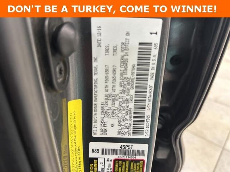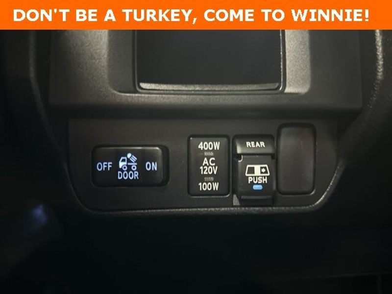 THIS VEHICLE IS EQUIPPED THE FOLLOWING FEATURES AND OPTIONS: ABS brakes, Air Conditioning, Alloy wheels, Compass, Electronic Stability Control, Illuminated entry, Low tire pressure warning, Remote keyless entry, Traction control, 120V/400W Deck Mounted AC Power, 6 Speakers, AM/FM radio: SiriusXM, Anti-whiplash front head restraints, Auto-Dimming Inside Rear-View Mirror w/Compass, Auto-dimming Rear-View mirror, Brake assist, Bumpers: body-color, CD player, Color-Keyed Overfenders, Cruise Control, Driver door bin, Dual front impact airbags, Dual front side impact airbags, Engine Immobilizer, Exterior Parking Camera Rear, Fabric Seat Trim (FD), Front anti-roll bar, Front Bucket Seats, Front Center Armrest, Front fog lights, Front reading lights, Front wheel independent suspension, Knee airbag, Leather Shift Knob, LED Daytime Running Lights, Occupant sensing airbag, Outside temperature display, Overhead airbag, Overhead console, Panic alarm, Passenger door bin, Power door mirrors, Power Sliding Rear Window w/Privacy Glass, Power steering, Power windows, Radio: Entune Premium w/AM/FM/CD/Nav/App Suite, Rear step bumper, Remote Keyless Entry System, Security system, Smart Key w/Push Button Start, Speed control, Speed-sensing steering, Split folding rear seat, Steering wheel mounted audio controls, Tachometer, Telescoping steering wheel, Tilt steering wheel, Trip computer, Turn signal indicator mirrors, Variable Intermittent Wipers, Variably intermittent wipers, Wheels: 17'' x 7.5'' Machined Alloy, and Wide Angle Front Fog Lamps.
