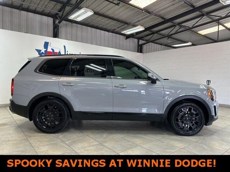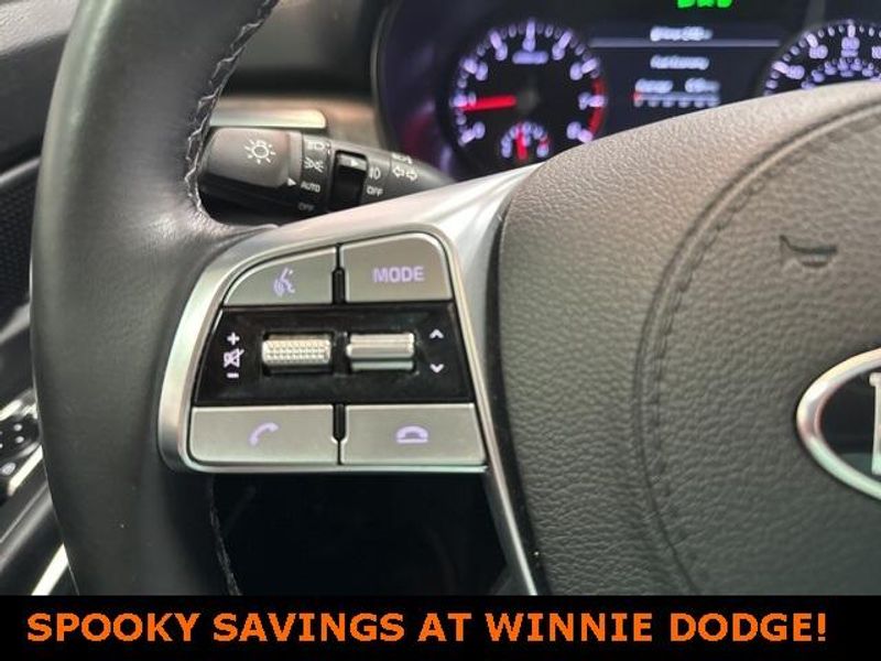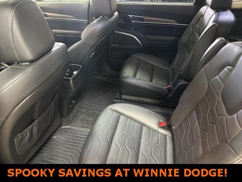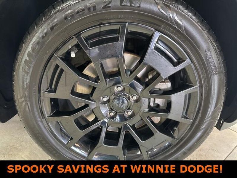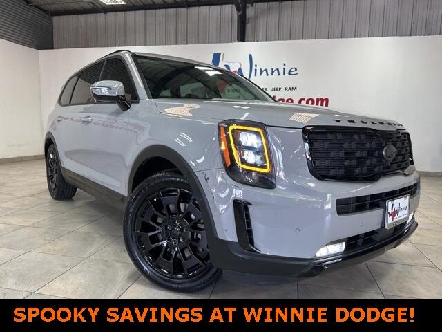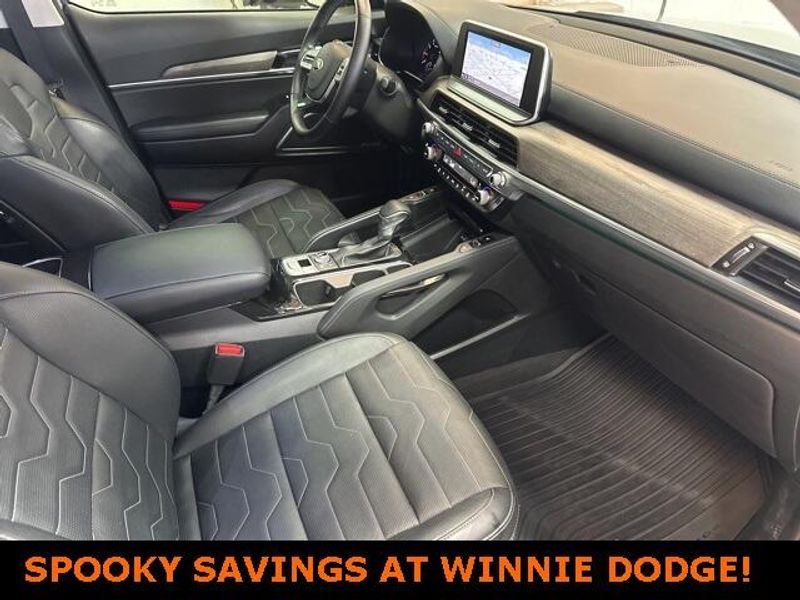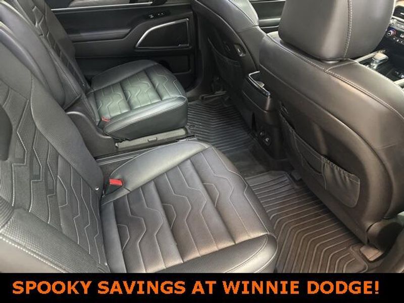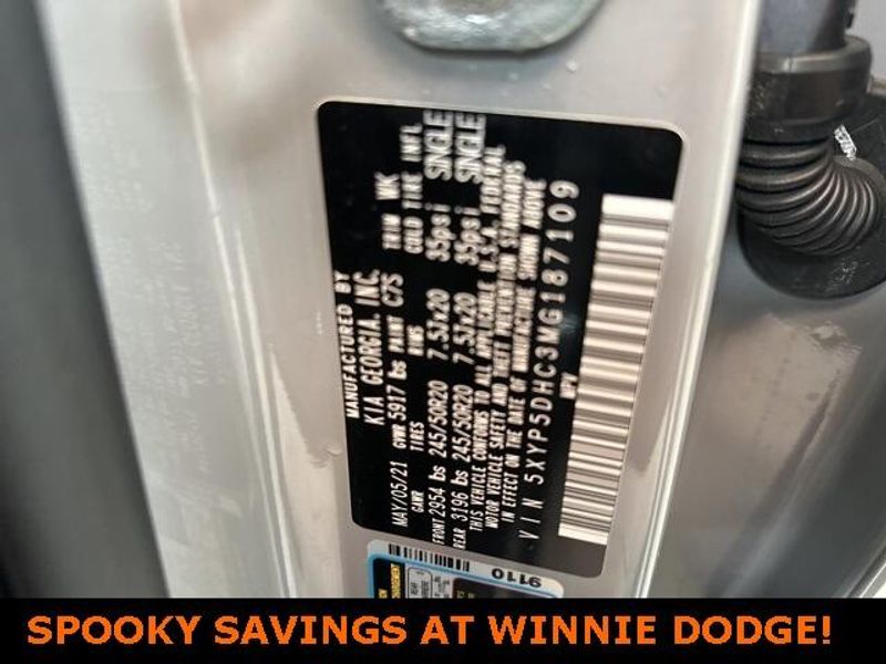 THIS VEHICLE IS EQUIPPED THE FOLLOWING FEATURES AND OPTIONS: Nightfall Edition Package (Black Finish Radiator Grille, Body Color Exterior Door Handles, Exclusive Black Fog Light Bezel, Exclusive Black Headlight Bezels, Front & Rear Gloss Black Finish Bumper Skid Plates, Front & Rear KIA Logo, Gloss Black Finish Exterior Emblems, Gloss Black Finish Front & Rear Door Garnish, Gloss Black Finish Roof Rails, and Wheels: 7.5'' x 20'' Exclusive Black Finish Alloy), SX Prestige Package (110V Inverter, Heads-Up Display, Heated & Ventilated 2nd Row Seats, Premium Cloth Headliner & Pillar Trim, Premium Nappa Leather Seat Trim, and Rain-Sensing Front Windshield Wipers), Towing Package (Self Leveling Rear Suspension and Tow Hitch w/Harness (TOF)), 10 Speakers, 3.648 Axle Ratio, 3rd row seats: split-bench, 4-Wheel Disc Brakes, ABS brakes, Air Conditioning, Alloy wheels, AM/FM radio: SiriusXM, Apple CarPlay & Android Auto, Auto High-beam Headlights, Auto-dimming Rear-View mirror, Automatic temperature control, Brake assist, Bumpers: body-color, Cargo Net, Cargo Seatback Up Mat, Carpeted Floor Mats, Compass, Delay-off headlights, Driver door bin, Driver vanity mirror, Dual front impact airbags, Dual front side impact airbags, Electronic Stability Control, Emergency communication system: 911 Connect, Four wheel independent suspension, Front anti-roll bar, Front Bucket Seats, Front Center Armrest, Front dual zone A/C, Front fog lights, Front reading lights, Fully automatic headlights, Garage door transmitter: HomeLink, Heated & Ventilated Front Bucket Seats, Heated door mirrors, Heated front seats, Heated steering wheel, Illuminated entry, Knee airbag, Leather Seat Trim, Leather Shift Knob, Leather steering wheel, Low tire pressure warning, Memory seat, Mud Guard Kit, Navigation System, Occupant sensing airbag, Outside temperature display, Overhead airbag, Overhead console, Panic alarm, Passenger door bin, Passenger vanity mirror, Power door mirrors, Power driver seat, Power Liftgate, Power moonroof, Power passenger seat, Power steering, Power windows, Radio data system, Radio: AM/FM/SIRIUS Premium Audio, Rear air conditioning, Rear anti-roll bar, Rear audio controls, Rear reading lights, Rear window defroster, Rear window wiper, Reclining 3rd row seat, Remote keyless entry, Roof rack: rails only, Security system, Smart Key w/ Push Button and Remote Start, Speed control, Speed-sensing steering, Split folding rear seat, Spoiler, Steering wheel mounted audio controls, Tachometer, Telescoping steering wheel, Tilt steering wheel, Traction control, Trip computer, Turn signal indicator mirrors, Variably intermittent wipers, Ventilated front seats, and Wheels: 7.5'' x 20'' Black Finish Alloy.