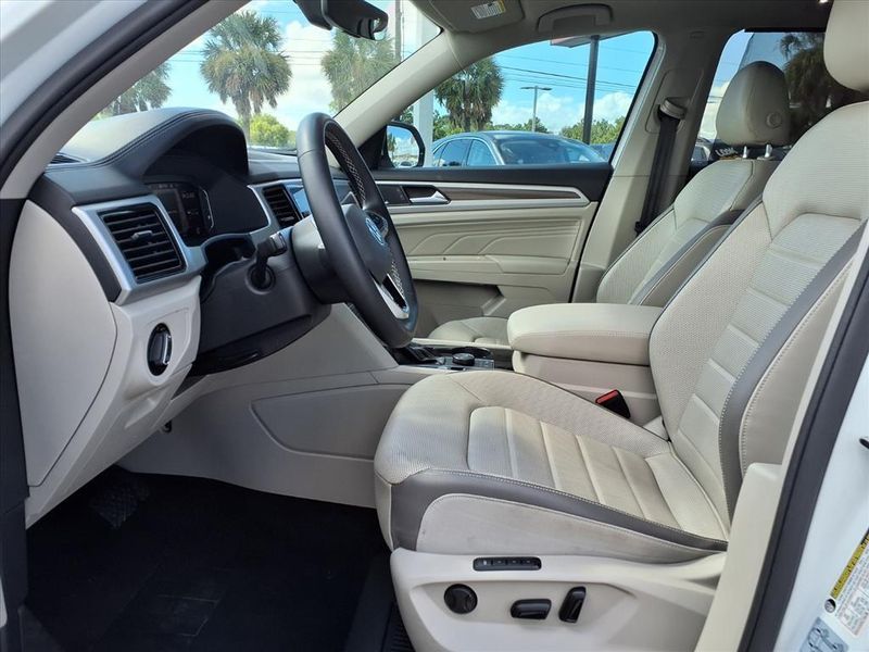 THIS VEHICLE IS EQUIPPED WITH THE FOLLOWING FEATURES AND OPTIONS :MDO Package (Captain's Chairs) (Frameless Self-Dimming Rearview Mirror, Heavy Duty Trunk Liner w/VW CarGo Blocks, Privacy Cover, and Rubber Mats Kit - Captain's Chairs), 12 Speakers, 2nd-Row Dual Captain's Chairs, 3.60 Axle Ratio, 3rd row seats: split-bench, 4-Wheel Disc Brakes, ABS brakes, Air Conditioning, Alloy wheels, Auto High-beam Headlights, Auto-dimming Rear-View mirror, Automatic temperature control, Brake assist, Bumpers: body-color, Compass, Delay-off headlights, Driver door bin, Driver vanity mirror, Dual front impact airbags, Dual front side impact airbags, Electronic Stability Control, Emergency communication system: VW Car-Net services (capabilities require enrollment or subscription), Four wheel independent suspension, Front anti-roll bar, Front Bucket Seats, Front Center Armrest, Front dual zone A/C, Front fog lights, Front reading lights, Fully automatic headlights, Heated door mirrors, Heated front seats, Heated rear seats, Heated steering wheel, Htd/Actively Ventilated Comfort Front Sport Seats, Illuminated entry, Leather Shift Knob, Low tire pressure warning, Memory seat, Navigation System, Occupant sensing airbag, Outside temperature display, Overhead airbag, Overhead console, Panic alarm, Passenger door bin, Passenger vanity mirror, Perforated Vienna Leather Seating Surfaces, Power door mirrors, Power driver seat, Power Liftgate, Power moonroof, Power passenger seat, Power steering, Power windows, Radio data system, Rain sensing wipers, Rear air conditioning, Rear anti-roll bar, Rear audio controls, Rear reading lights, Rear seat center armrest, Rear window defroster, Rear window wiper, Remote keyless entry, Roof rack: rails only, Security system, Speed control, Speed-sensing steering, Split folding rear seat, Spoiler, Standard Suspension, Steering wheel mounted audio controls, Tachometer, Telescoping steering wheel, Tilt steering wheel, Traction control, Trip computer, Turn signal indicator mirrors, Variably intermittent wipers, Ventilated front seats, Volkswagen Logo Puddle Lights, and Wheels: 20'' 5-Spoke 2-Tone Machined Alloy. Odometer is 1939 miles below market average!