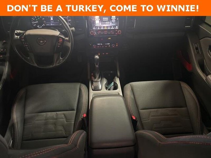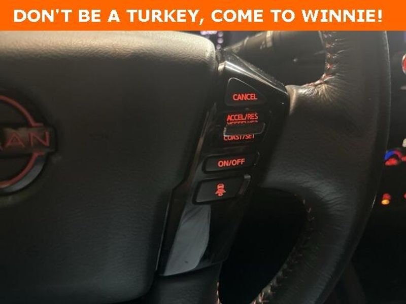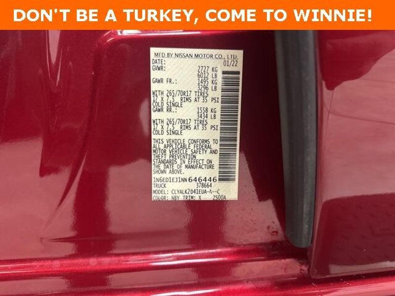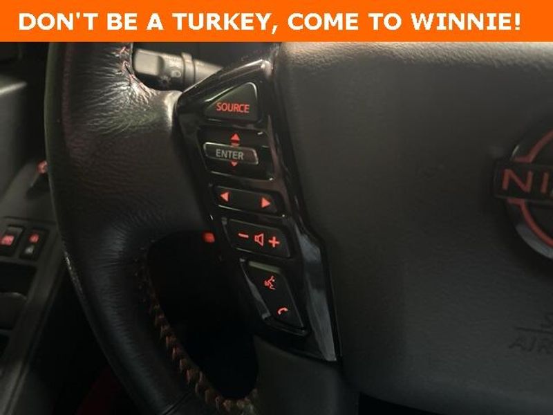 THIS VEHICLE IS EQUIPPED THE FOLLOWING FEATURES AND OPTIONS: 17'' Alloy Wheels, 3.692 Axle Ratio, 4-Wheel Disc Brakes, 6 Speakers, ABS brakes, Air Conditioning, Alloy wheels, AM/FM radio: SiriusXM, Anti-whiplash front head restraints, Auto High-beam Headlights, Automatic temperature control, Brake assist, Bumpers: body-color, Delay-off headlights, Driver door bin, Driver vanity mirror, Dual front impact airbags, Dual front side impact airbags, Electronic Stability Control, Emergency communication system: NissanConnect Services, Floor Mats, Front anti-roll bar, Front Bucket Seats, Front Center Armrest, Front dual zone A/C, Front fog lights, Front reading lights, Front wheel independent suspension, Fully automatic headlights, Illuminated entry, Knee airbag, Leather Shift Knob, Low tire pressure warning, Navigation system: Nissan Navigation with Voice Recognition, Occupant sensing airbag, Off-Road Style Step Rails, Overhead airbag, Overhead console, Panic alarm, Passenger door bin, Passenger vanity mirror, Power door mirrors, Power driver seat, Power steering, Power windows, PRO Embroidered Premium Cloth Seat Trim, PRO-X Mud Flaps, Radio data system, Radio: SXM/AM/FM/AUX/USB Audio System w/6 Speakers, Rear anti-roll bar, Rear seat center armrest, Rear step bumper, Remote Engine Start, Remote keyless entry, Security system, Speed control, Speed-sensing steering, Split folding rear seat, Steering wheel mounted audio controls, Tachometer, Tilt steering wheel, Traction control, Trip computer, Variably intermittent wipers, and Voltmeter.