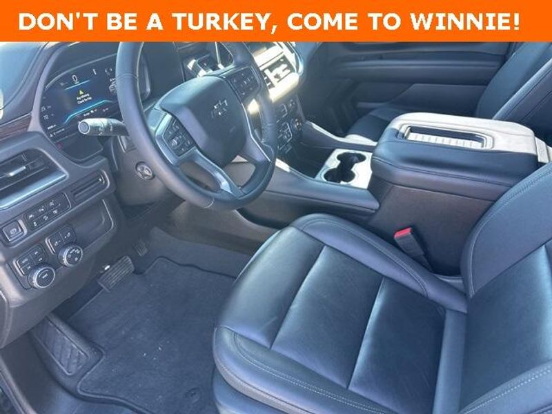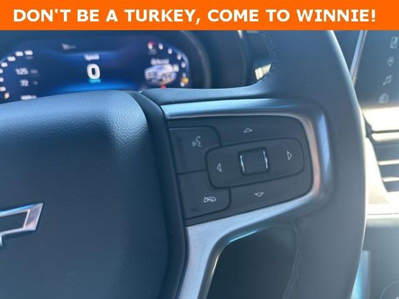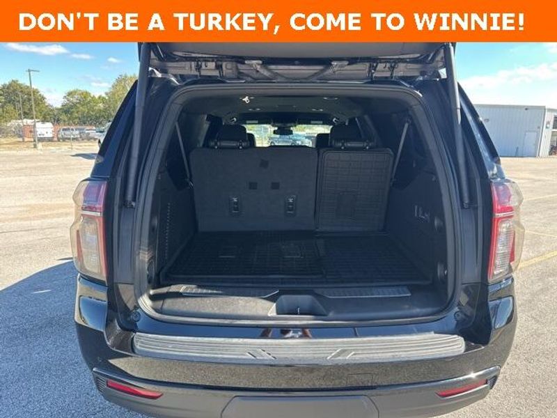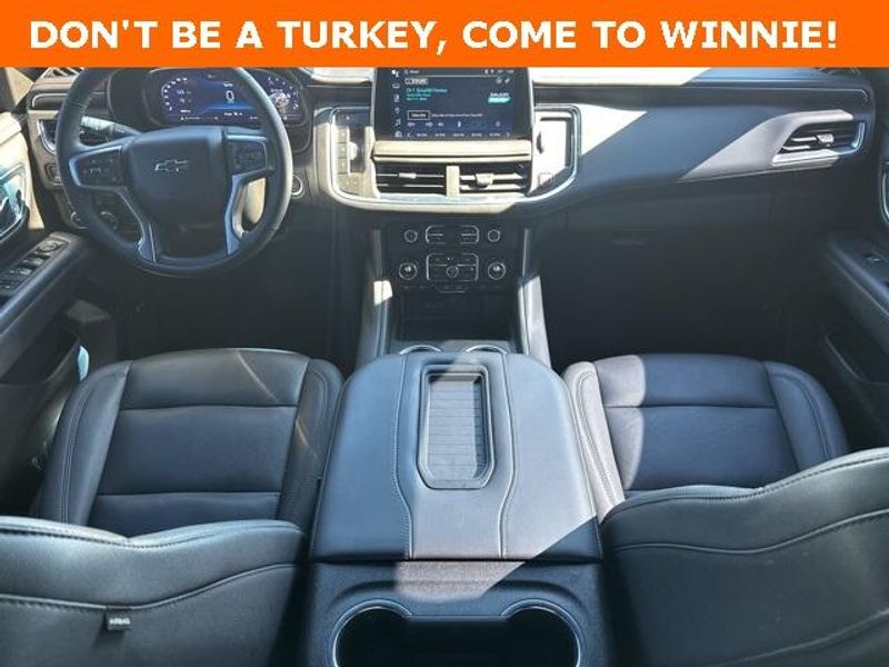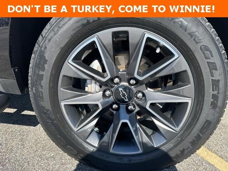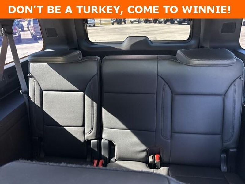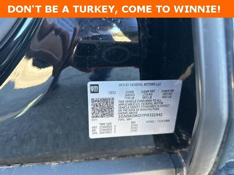 THIS VEHICLE IS EQUIPPED THE FOLLOWING FEATURES AND OPTIONS: Driver Alert Package (Lane Change Alert w/Side Blind Zone Alert and Rear Cross Traffic Alert), License Plate Front Mounting Package, Luxury Package (2nd Row Pwr Release 60/40 Split-Folding Bench Seat, 3rd Row 60/40 Power-Folding Split-Bench, HD Surround Vision, Heated 2nd Row Outboard Seats, Heated Steering Wheel, Memory Settings, Outside Heated Power-Adjustable Mirrors, Power Tilt & Telescopic Steering Column, and Rear Pedestrian Alert), Preferred Equipment Group 2Z7 (10-Way Power Driver & Passenger Seat Adjusters, 1st & 2nd Row Color-Keyed Carpeted Floor Mats, 2-Speed Active Electronic AutoTrac Transfer Case, Auto-Dimming Inside Rear-View Mirror, Black Tubular Assist Steps, Bose 9-Speaker Stereo Audio System Feature, Bright Front & Rear Door Sill Plates, Color-Keyed Carpeting Floor Covering, Driver & Front Outboard Passenger Airbags, Enhanced Driver Information Center, Floor Console w/Storage Area, Front High-Approach Angle Fascia, Hands-Free Rear Power Programmable Liftgate, Heated Driver & Front Passenger Seats, Heavy-Duty Air Filter, Hill Descent Control, Infotainment Display, LED Daytime Running Lamps, Memory Settings For Driver, Red Recovery Hooks, Remote Start, SiriusXM Radio w/360L, Universal Home Remote, Wireless Charging, and Wrapped Steering Wheel), 3.23 Rear Axle Ratio, 3rd row seats: split-bench, 4-Wheel Disc Brakes, 9 Speakers, ABS brakes, Air Conditioning, Alloy wheels, AM/FM radio: SiriusXM with 360L, Apple CarPlay/Android Auto, Auto High-beam Headlights, Auto-dimming Rear-View mirror, Automatic temperature control, Brake assist, Bumpers: body-color, Cargo Security Shade (LPO), Compass, Console-Mounted Safe (LPO), Delay-off headlights, Driver door bin, Driver vanity mirror, Dual front impact airbags, Dual front side impact airbags, Electronic Stability Control, Emergency communication system: OnStar and Chevrolet connected services capable, Four wheel independent suspension, Front anti-roll bar, Front Bucket Seats, Front Center Armrest, Front dual zone A/C, Front reading lights, Fully automatic headlights, Garage door transmitter, Heated door mirrors, Heated front seats, Illuminated entry, Leather-Appointed Seating, Low tire pressure warning, Memory seat, Navigation System, Occupant sensing airbag, Outside temperature display, Overhead airbag, Overhead console, Panic alarm, Passenger door bin, Passenger vanity mirror, Power door mirrors, Power driver seat, Power Liftgate, Power passenger seat, Power steering, Power windows, Premium audio system: Chevrolet Infotainment 3 Premium, Premium Smooth Ride Suspension, Radio: Chevrolet Infotainment 3 Premium System, Rain sensing wipers, Rear air conditioning, Rear anti-roll bar, Rear reading lights, Rear seat center armrest, Rear window defroster, Rear window wiper, Remote keyless entry, Roof rack: rails only, Security system, Speed control, Speed-sensing steering, Split folding rear seat, Spoiler, Steering wheel mounted audio controls, Tachometer, Telescoping steering wheel, Tilt steering wheel, Traction control, Trip computer, Variably intermittent wipers, Voltmeter, and Wheels: 20'' x 9'' Machined Aluminum.