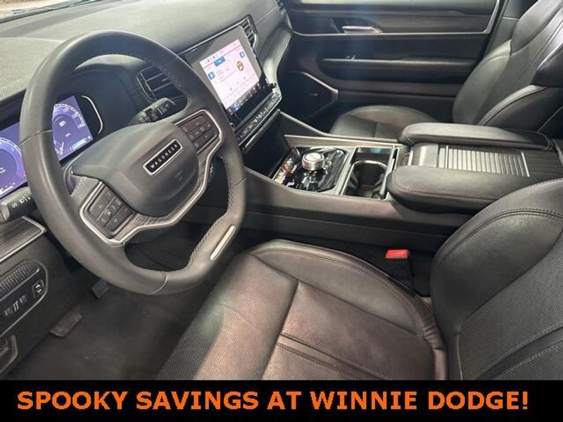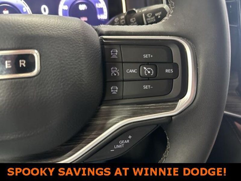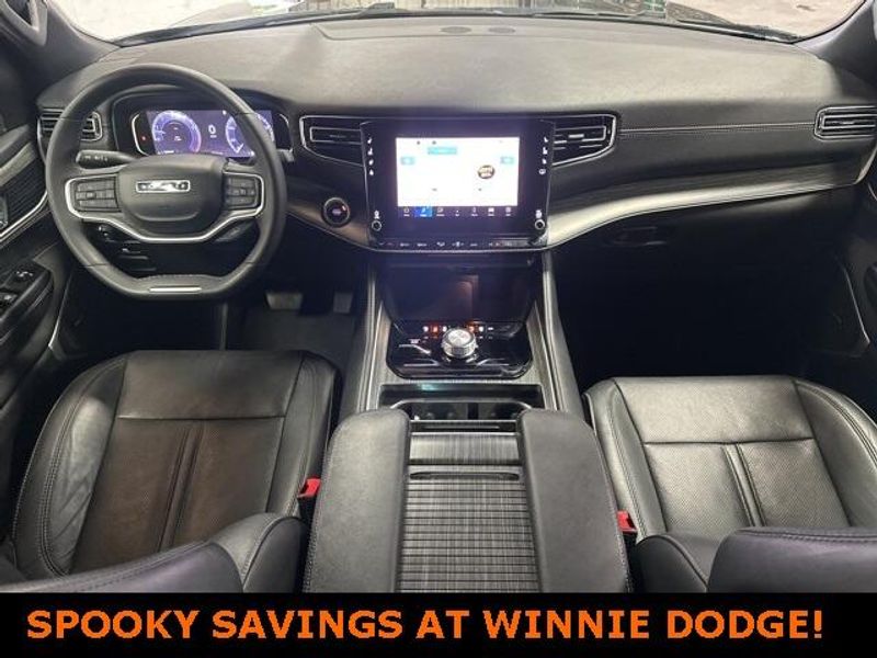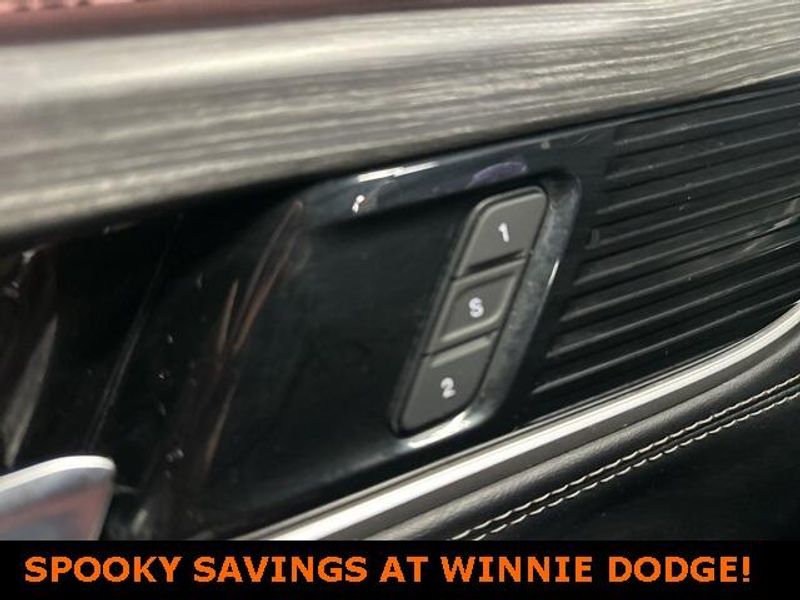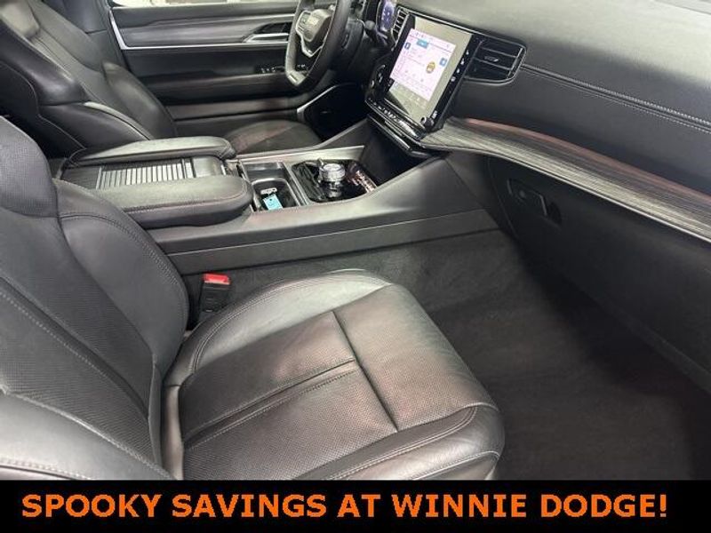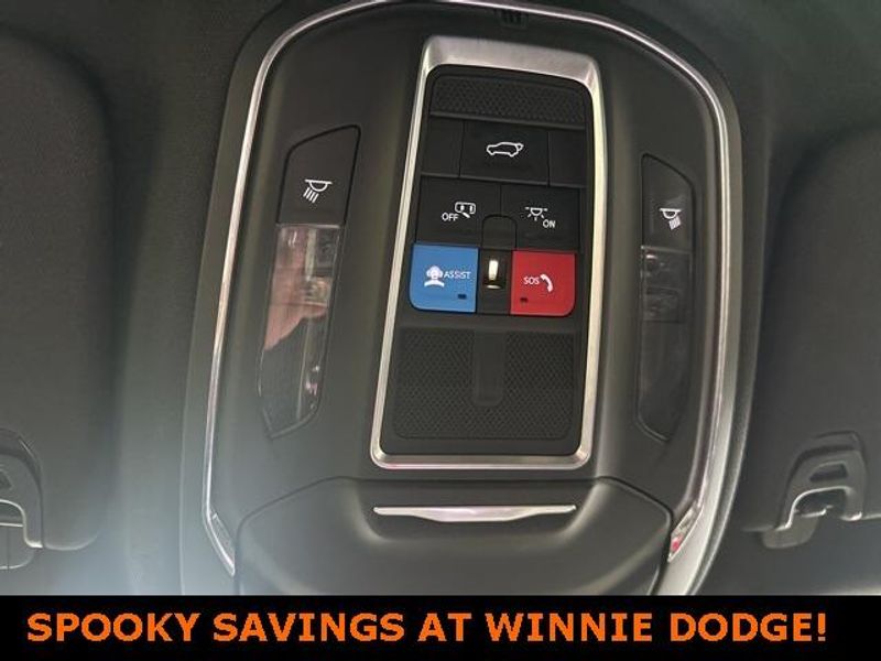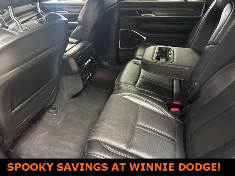 THIS VEHICLE IS EQUIPPED THE FOLLOWING FEATURES AND OPTIONS: Quick Order Package 25J, 10 Speakers, 3.55 Rear Axle Ratio, 3rd row seats: bench, 4-Wheel Disc Brakes, ABS brakes, Adjustable pedals, Air Conditioning, Alloy wheels, AM/FM radio: SiriusXM with 360L, Anti-whiplash front head restraints, Audio memory, Auto-dimming door mirrors, Auto-dimming Rear-View mirror, Auto-leveling suspension, Automatic temperature control, Brake assist, Bumpers: body-color, Compass, Delay-off headlights, Driver door bin, Driver vanity mirror, Driver's Seat Mounted Armrest, Dual front impact airbags, Dual front side impact airbags, Electronic Stability Control, Emergency communication system: Automatic SOS Call, Exterior Parking Camera Rear, Four wheel independent suspension, Front anti-roll bar, Front Bucket Seats, Front Center Armrest w/Storage, Front dual zone A/C, Front fog lights, Front reading lights, Fully automatic headlights, Garage door transmitter, Genuine wood console insert, Genuine wood dashboard insert, Genuine wood door panel insert, Heated door mirrors, Heated front seats, Heated steering wheel, Illuminated entry, Knee airbag, Leather Trimmed Bucket Seats, Low tire pressure warning, Memory seat, Navigation System, Normal Duty Suspension, Occupant sensing airbag, Outside temperature display, Overhead airbag, Overhead console, Panic alarm, Passenger door bin, Passenger seat mounted armrest, Passenger vanity mirror, Pedal memory, Power adjustable front head restraints, Power door mirrors, Power driver seat, Power Liftgate, Power passenger seat, Power steering, Power windows, Radio data system, Radio: Uconnect 5 Nav w/10.1'' Display, Rain sensing wipers, Rear air conditioning, Rear anti-roll bar, Rear reading lights, Rear seat center armrest, Rear window defroster, Rear window wiper, Reclining 3rd row seat, Remote keyless entry, Security system, Speed control, Speed-sensing steering, Speed-Sensitive Wipers, Split folding rear seat, Steering wheel memory, Steering wheel mounted audio controls, Tachometer, Telescoping steering wheel, Tilt steering wheel, Traction control, Trip computer, Turn signal indicator mirrors, Variably intermittent wipers, Ventilated front seats, Voltmeter, and Wheels: 20'' x 9.0'' Premium 2 Aluminum.