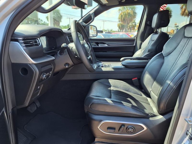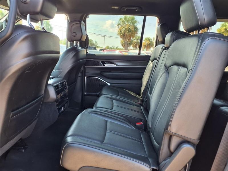 THIS VEHICLE IS EQUIPPED WITH THE FOLLOWING FEATURES AND OPTIONS :Quick Order Package 25J, 10 Speakers, 3.55 Rear Axle Ratio, 3rd row seats: bench, 4-Wheel Disc Brakes, ABS brakes, Adjustable pedals, Air Conditioning, Alloy wheels, AM/FM radio: SiriusXM with 360L, Anti-whiplash front head restraints, Audio memory, Auto-dimming door mirrors, Auto-dimming Rear-View mirror, Auto-leveling suspension, Automatic temperature control, Brake assist, Bumpers: body-color, Compass, Delay-off headlights, Driver door bin, Driver vanity mirror, Driver's Seat Mounted Armrest, Dual front impact airbags, Dual front side impact airbags, Electronic Stability Control, Emergency communication system: Automatic SOS Call, Exterior Parking Camera Rear, Four wheel independent suspension, Front anti-roll bar, Front Bucket Seats, Front Center Armrest w/Storage, Front dual zone A/C, Front fog lights, Front reading lights, Fully automatic headlights, Garage door transmitter, Genuine wood console insert, Genuine wood dashboard insert, Genuine wood door panel insert, Heated door mirrors, Heated front seats, Heated steering wheel, Illuminated entry, Knee airbag, Leather Trimmed Bucket Seats, Low tire pressure warning, Memory seat, Navigation System, Normal Duty Suspension, Occupant sensing airbag, Outside temperature display, Overhead airbag, Overhead console, Panic alarm, Passenger door bin, Passenger seat mounted armrest, Passenger vanity mirror, Pedal memory, Power adjustable front head restraints, Power door mirrors, Power driver seat, Power Liftgate, Power passenger seat, Power steering, Power windows, Radio data system, Radio: Uconnect 5 Nav w/10.1'' Display, Rain sensing wipers, Rear air conditioning, Rear anti-roll bar, Rear reading lights, Rear seat center armrest, Rear window defroster, Rear window wiper, Reclining 3rd row seat, Remote keyless entry, Security system, Speed control, Speed-sensing steering, Speed-Sensitive Wipers, Split folding rear seat, Steering wheel memory, Steering wheel mounted audio controls, Tachometer, Telescoping steering wheel, Tilt steering wheel, Traction control, Trip computer, Turn signal indicator mirrors, Variably intermittent wipers, Ventilated front seats, Voltmeter, and Wheels: 20'' x 9.0'' Premium 2 Aluminum.