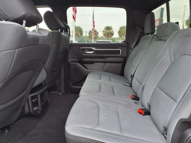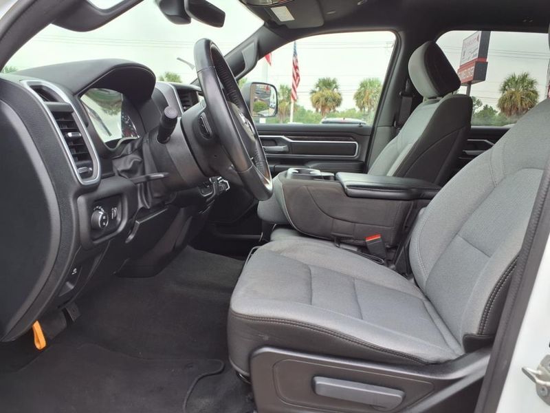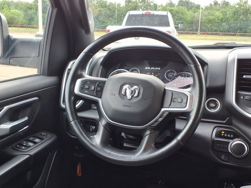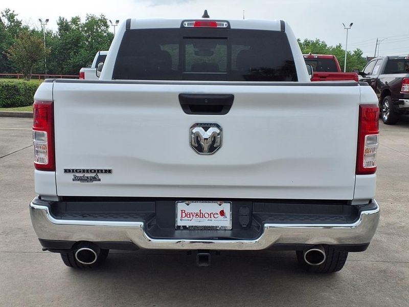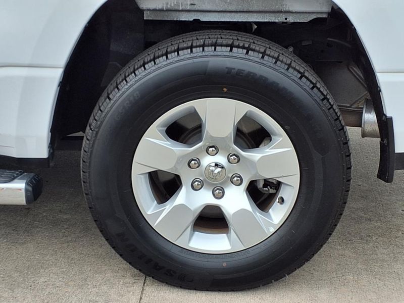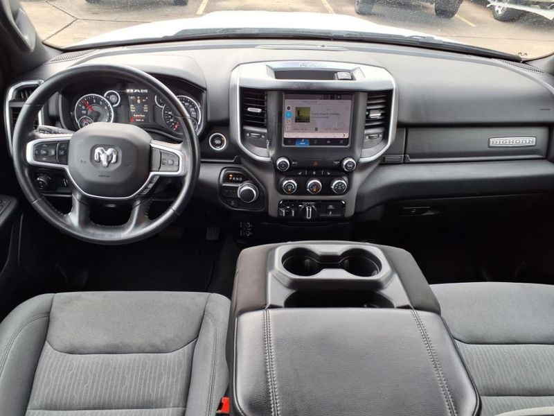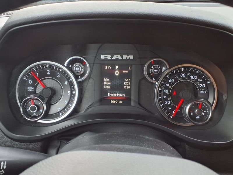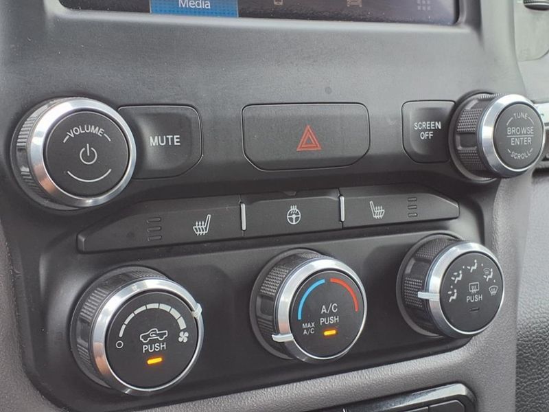 THIS VEHICLE IS EQUIPPED WITH THE FOLLOWING FEATURES AND OPTIONS :Bed Utility Group (MOPAR 4 Adjustable Cargo Tie-Down Hooks, MOPAR Deployable Bed Step, MOPAR Spray In Bedliner, and Pick-Up Box Lighting), Big Horn Level 1 Equipment Group (2nd Row In Floor Storage Bins, 4G LTE Wi-Fi Hot Spot, 8.4'' Touchscreen Display, Apple CarPlay, Auto-Dimming Exterior Driver Mirror, Auto-Dimming Rear-View Mirror, Black Exterior Mirrors, Black Premium Power Mirrors, Bluetooth Handsfree Phone & Audio, Class IV Receiver Hitch, Connectivity - US/Canada, Convex Wide-Angle Exterior Mirror Insert, Exterior Mirrors Courtesy Lamps, Exterior Mirrors w/Heating Element, Exterior Mirrors w/Supplemental Signals, For Details, Visit DriveUconnect.com, For More Info, Call 800-643-2112, Front Fog Lamps, Glove Box Lamp, Google Android Auto, GPS Antenna Input, Heated Front Seats, Heated Steering Wheel, Integrated Center Stack Radio, Passenger Sun Visor w/Illuminated Mirror, Power-Folding Mirrors, Radio: Uconnect 5 W w/8.4'' Display, Rear Dome w/On/Off Switch Lamp, Rear Power Sliding Window, Rear Window Defroster, SiriusXM Satellite Radio, and USB Host Flip), Quick Order Package 27Z Big Horn (Big Horn Badge), Trailer Tow Group (Trailer Brake Control, Trailer Light Check, Trailer Reverse Steering Control, Trailer Tire Pressure Monitoring System, and Trailer Tow Mirrors), 3 Rear Seat Head Restraints, 3.21 Rear Axle Ratio, 4 Way Front Headrests, 4-Wheel Disc Brakes, 48V Belt Starter Generator, 6 Speakers, ABS brakes, Air Conditioning, Alloy wheels, AM/FM radio, Black Trailer Tow Power Mirrors (DISC), Brake assist, Bumpers: chrome, Cloth Bench Seat, Compass, Delay-off headlights, Driver door bin, Dual front impact airbags, Dual front side impact airbags, Electronic Stability Control, Emergency communication system: SiriusXM Guardian, Exterior Parking Camera Rear, Front anti-roll bar, Front Center Armrest w/Storage, Front License Plate Bracket, Front reading lights, Front Seat Back Map Pockets, Front wheel independent suspension, Fully automatic headlights, Global Telematics Box Module (TBM), Heated door mirrors, Illuminated entry, Integrated Voice Command w/Bluetooth, Leather steering wheel, Low tire pressure warning, Manufacturer's Statement of Origin, Occupant sensing airbag, Outside temperature display, Overhead airbag, Overhead console, Panic alarm, Passenger door bin, Passenger vanity mirror, Power door mirrors, Power steering, Power windows, Radio data system, Radio: Uconnect 3 w/5'' Display, RAM Grille Badge - Chrome, Rear 60/40 Folding Seat, Rear anti-roll bar, Rear seat center armrest, Rear step bumper, Remote keyless entry, Speed control, Split folding rear seat, Steering wheel mounted audio controls, Tachometer, Telescoping steering wheel, Tilt steering wheel, Traction control, Trip computer, Variably intermittent wipers, Voltmeter, Wheel to Wheel Side Steps, and Wheels: 18'' x 8'' Cast-Aluminum PainteD.